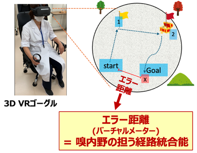 ADの最初期病変は、嗅内野※6へのタウ沈着から始まることが知られています。また、嗅内野は経路統合能を担います。従来は、海馬が担う記憶などに関する高次脳機能試験がADに気づく検査として使われてきましたが、経路統合能を評価できる検査方法を用いることで海馬に病変が及ぶ前にADに気づくことができる可能性があります。本研究は経路統合能を評価できる3D VRナビゲーション課題を用い、血液AD関連バイオマーカーとの関係を調べました。