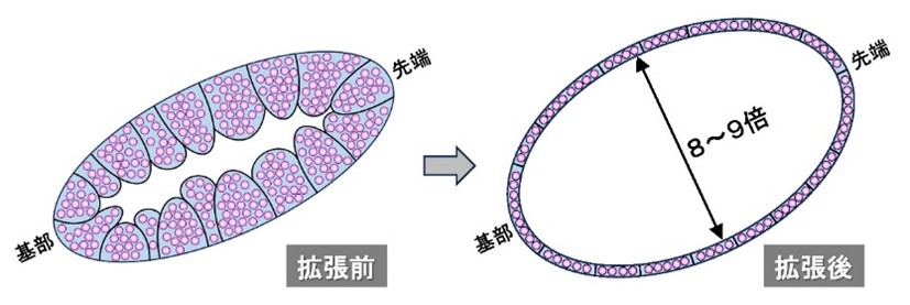 - このことにより細胞は形の自由度が増し、成虫化後に附属腺を大きく膨らませることができますが、それと同時に、ほかの昆虫では発達している附属腺外側の筋肉が退化し、附属腺を絞ることには適さない形態であることが分かりました。