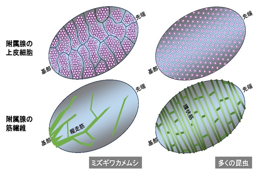 - 環境河川や湖沼の岸辺に生息する昆虫ミズギワカメムシは、附属腺細胞が他の昆虫と大きく異なり、数十個の核が1つの細胞に含まれる合胞体(細胞融合によってできる細胞)から成ることが分かりました。