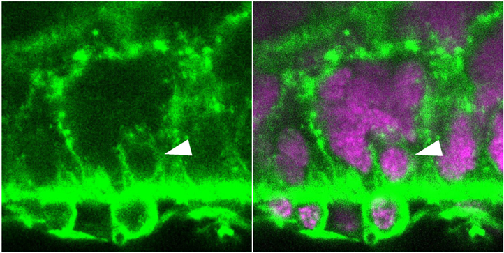 このような合胞体進化がいつから生じたのかを知るために、ミズギワカメムシ下目に含まれる5つの属を調べたところ、その全てにおいて似た細胞形態が見られた一方、起源については不明でした。しかしまだ調べられていない多数の属があるので、今後はその起源が調べられ、合胞体が生まれた理由が分かる可能性があります。またこの合胞体の発生過程を調べたところ、単層上皮の内腔側に存在する多核細胞が、外側の単層上皮から脱離した細胞を一つ一つ取り込むことによって、多核化が進行してゆく過程(エントーシス)が、少なくとも2回脱皮前の若虫期以降で起きていることが分かりました(図4)。このような若いステージでの生殖器官分化は他の昆虫ではあまり見られないことで、発生初期のプログラムが変更されている古い起源の性質であることが伺われます。一方、このようなエントーシスは他の多細胞生物においても知られ、意外なことに哺乳類の子宮で胚の着床が起きるとき、合胞体栄養膜細胞が子宮内膜上皮細胞を取り込んで消化する前段階などにも似た現象が見られます。これらの一見共通した現象が、同じメカニズムによるのか、異なる仕組みで生じるのかといった疑問にもいずれ答えが出されることでしょう。