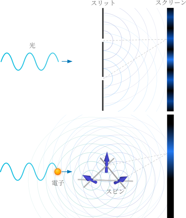 2重スリットの実験では、それぞれのスリットを通った光の干渉により縞模様が生じる。磁気散乱では、それぞれのスピンで散乱された電子波の干渉により電子の軌道が曲がり、上方向に飛んでいく。