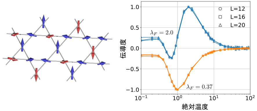 1つ目は、近接スピン相関と遠距離スピン相関の競合です。高温では近接相関が支配的ですが、温度が下がると遠距離相関の影響が大きくなり、両者の寄与が競合することで非単調な振る舞いが生じます。2つ目は、高磁場領域ではスピン相関自体が非単調な温度依存性を示すことです。この結果、ホール伝導度の符号反転を引き起こします。これらの効果は、フェルミ波長の値によって異なる現れ方をすることも明らかになりました。