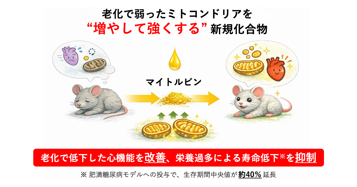 これらの化合物は培養細胞やマウスにおいてミトコンドリア機能を高め、老齢マウスの心機能低下を顕著に改善しました。さらに、高脂肪食を負荷した肥満糖尿病マウスに改良型マイトルビンを投与したところ、生存期間中央値※3が約40%延長しました。本成果は、ミトコンドリアの機能低下が関係する多くの加齢性疾患や、国の指定難病の一つであるミトコンドリア病等に対する新たな治療戦略の基盤となる可能性を示すものです。