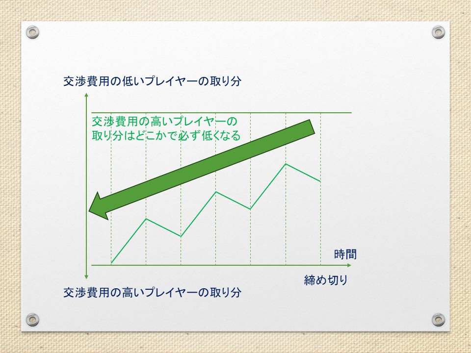 交渉の過程をゲーム理論を使って分析しました。交互に提案する交渉では、プレイヤーは相手が次に最後通牒をしてくると予想すると、自分の提案が断られたら交渉を打ち切ります。交渉を続けるとコストがかかるのに、相手の提案からはなにも受け取れないからです。提案が断られたら、交渉を打ち切るということで、提案においては強い立場で臨むことができます。そこで、提案者は最後通牒として自分の取り分を最大にするように要求できます。交渉の費用が高いプレイヤーの取り分はどこかで必ず低くなるので、相手の提案からはほとんどなにも受け取れない状況は、締め切りがある交互に提案する交渉では必ず起こり、最後通牒が常になされることになります。
