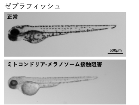 最後に、モデル生物であるゼブラフィッシュを用いて生体レベルでの検証を行いました。ゼブラフィッシュは体表に明瞭な黒色色素細胞を持つため、色素形成の解析に適しています。ミトコンドリア-メラノソーム接触を薬理学的に破壊すると、体表の黒色色素が著しく減少し、色素が消失しました。この結果は、細胞レベルで明らかになったコンタクト機構が、生体全体の色素形成に直結していることを示しています。