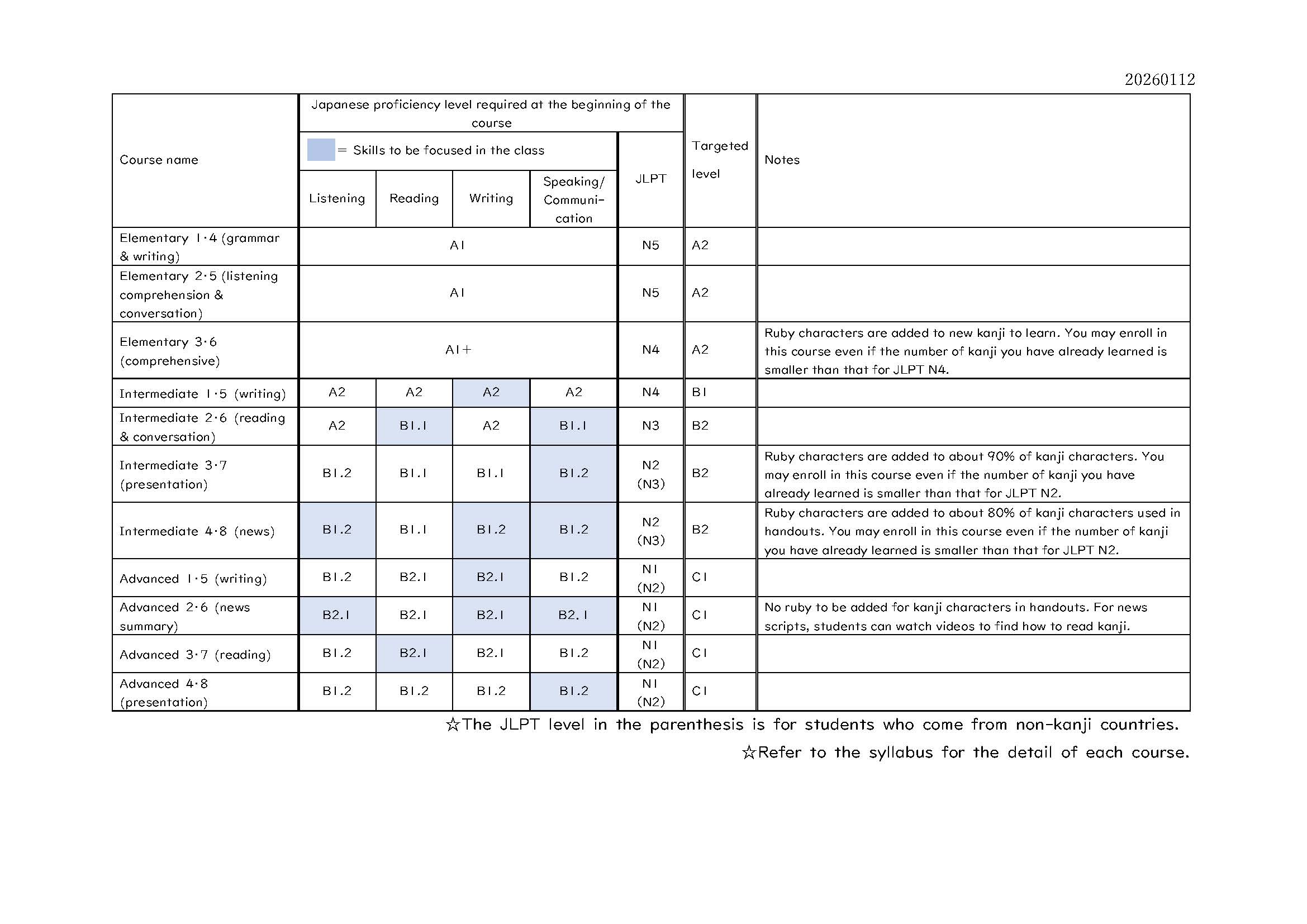 | Course description | These courses mainly aim to help students having the CEFR A2 level of reading, writing, listening and speaking skills further improve their reading and writing fluency. No special exercise is provided for listening and speaking, but participants are given many opportunities to listen and speak Japanese in class. |