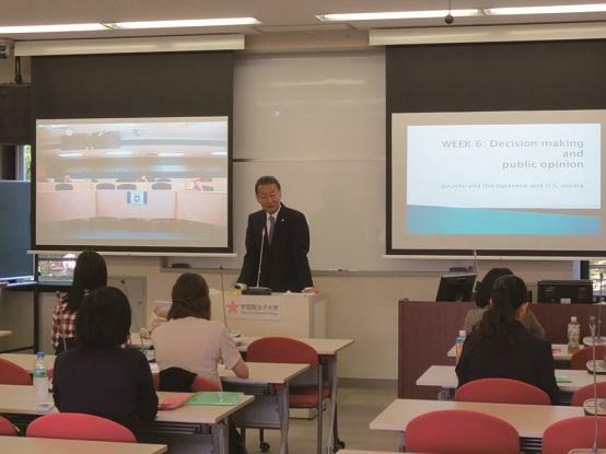 本プログラムは、両大学が共同で開発したものです。両大学の教員が、ひとつの授業をチームとして担当します。授業の目的は、担当教員がそれぞれの専門分野を軸として、環太平洋地域の社会経済や国際関係を学際的に探究することです。授業は一方通行ではなく、先方の教員にリアルタイムで質問したり、学生同士で討論することも可能で、対面式と比べても遜色のないものとなっています。先方で示される資料は別スクリーンでこちらに示され、こちらの質問者は先方の教員の前に大きく映し出されます。このシステムは英語圏の大学の授業が日本の大学で同時に行われるという、他ではほとんど類を見ない革新的なものです。