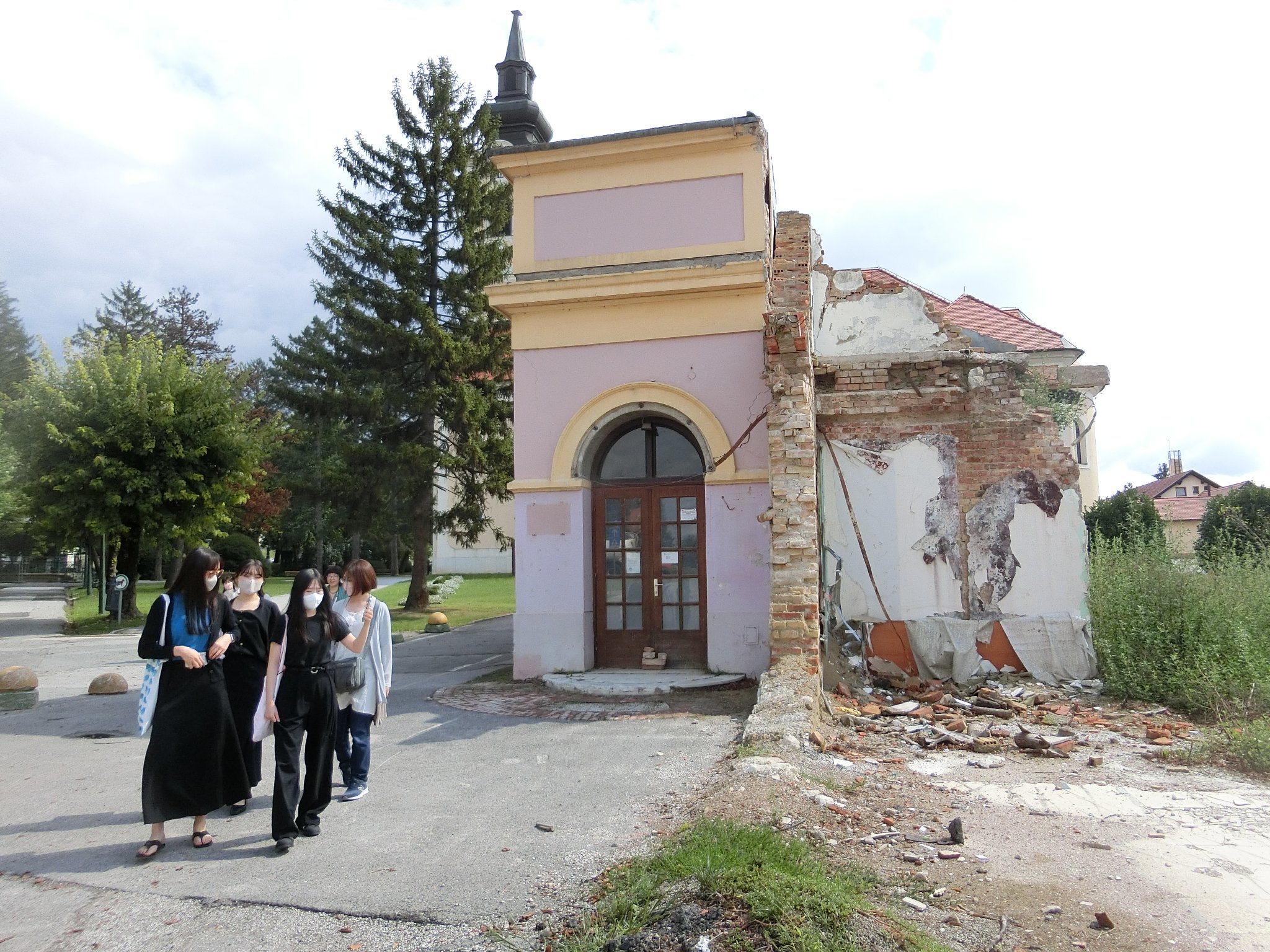 マラ・ゴリツァ村の日本難民センターの敷地も散策しました。入り口にはペトリニヤ市の大地震で倒壊した家屋の瓦礫が積み上げられていましたが、かつて大勢の難民や国内避難民が日本のODAによって建設されたこの施設に20年もの間、居住していたことに思いを馳せました。