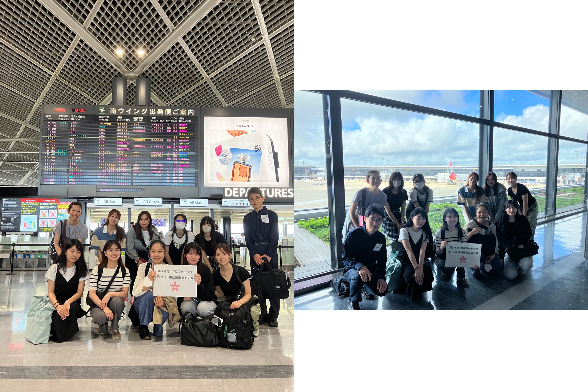 【中欧研修1日目】学習院女子大学第15回中欧国際協力研修が始まりました。成田空港に集合し、オーストリア航空の直行便でウィーンに到着しました。ウィーン空港ではCity Airport Trainに乗りました。3年ぶりの昨年の研修では3、4年生だけでしたが、今回は2年生も参加しています。