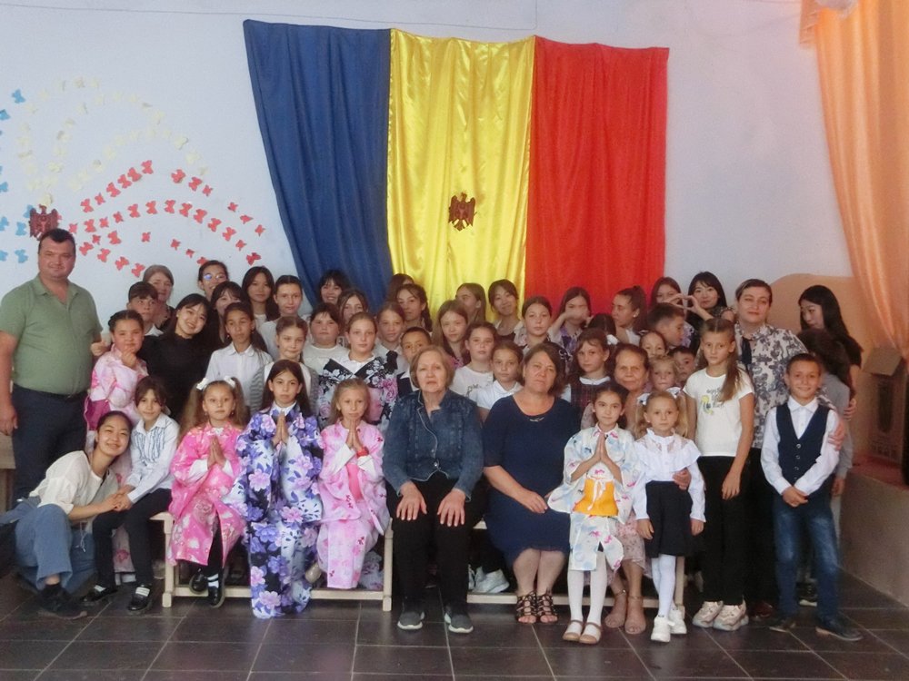 モルドヴァ共和国の大きな国旗の前で子供たち、校長先生、村長さんと一緒に集合写真を撮りました。