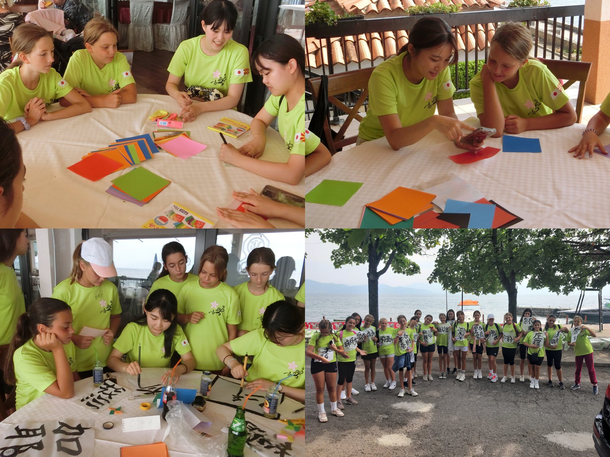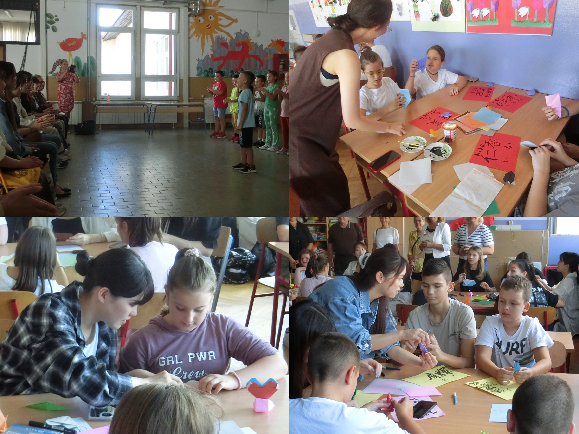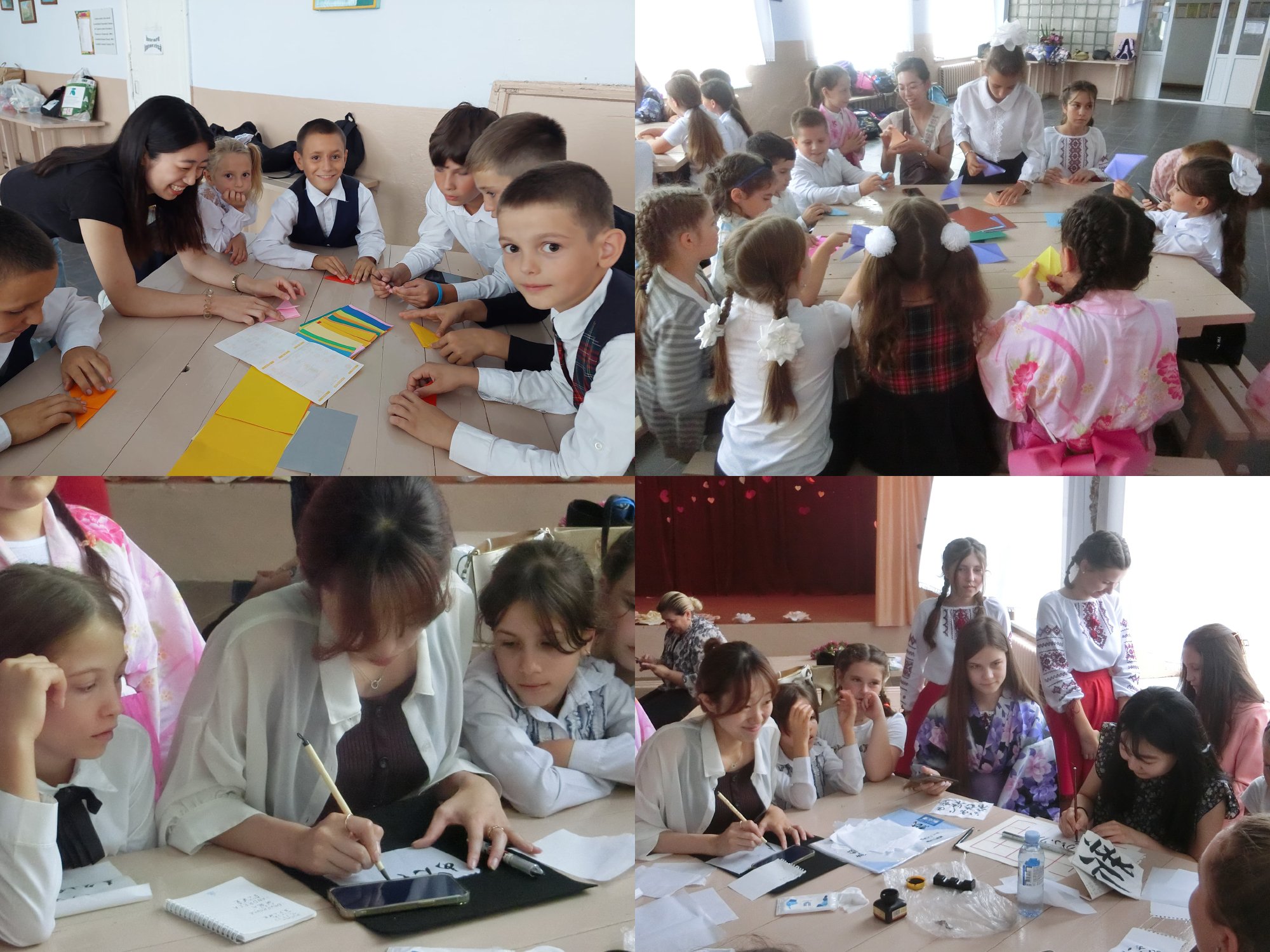 校長先生と副市長による歓迎のご挨拶の後、子供たちによる民族舞踊が披露されました。北マケドニアとモルドヴァでの経験を生かして折り紙と書道で子供たちと交流しました。仁香(ニカ)、衣莉奈(イリナ)といった具合に、子供たちの名前が次々と漢字で記されていきました。