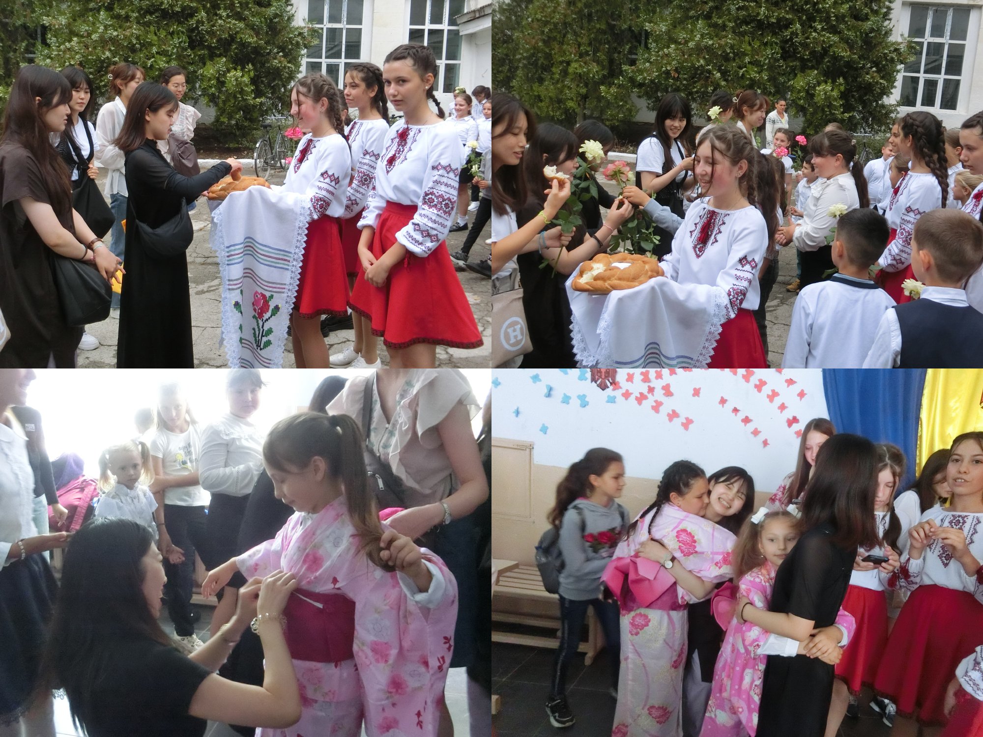 【中欧研修13日目】井戸水で生活が営まれているカザネシュティ村の小学校に到着すると、民族衣装を着た子供たちが伝統に則ってパンと塩とお花で歓迎してくれました。浴衣を着せてあげると大喜びでした。まだまだ甘えたい年頃で、子供たちはすぐにしがみついてきます。