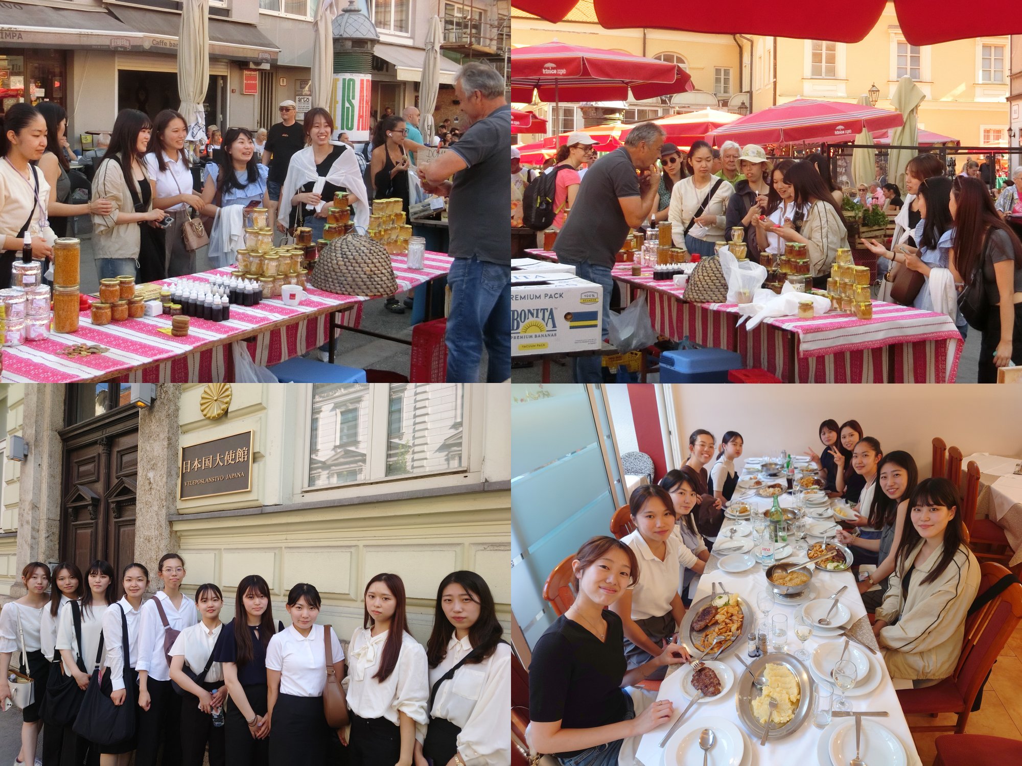 【中欧研修17日目】首都においては青果市場の蜂蜜屋でクロアチアの経済状況を調査しました。午後には日本大使館を訪問し、専門調査員を務めている本学の卒業生と磯大使、大島書記官よりお話を伺いました。最後の夕食会では名物のロールキャベツなどを味わいつつ研修を振り返りました。
