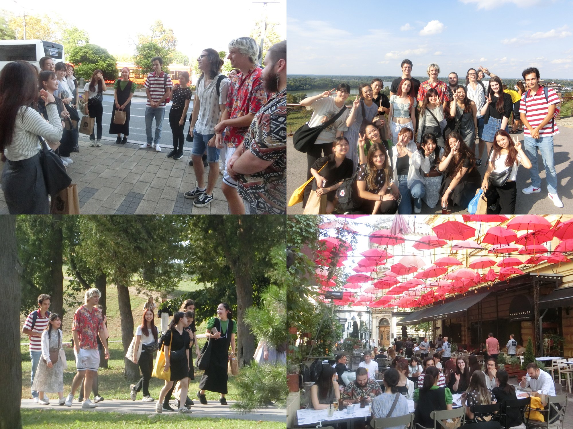 続いて、セルビアの最高学府であるベオグラード大学の前で日本語学科の学生たちと会いました。日本語で挨拶した後、ドナウ川に面するカレメグダン城址公園を一緒に散策し、カフェテラスで歓談しました。短時間の交流ながらもすっかり仲良くなり、ハグしてお別れしました。