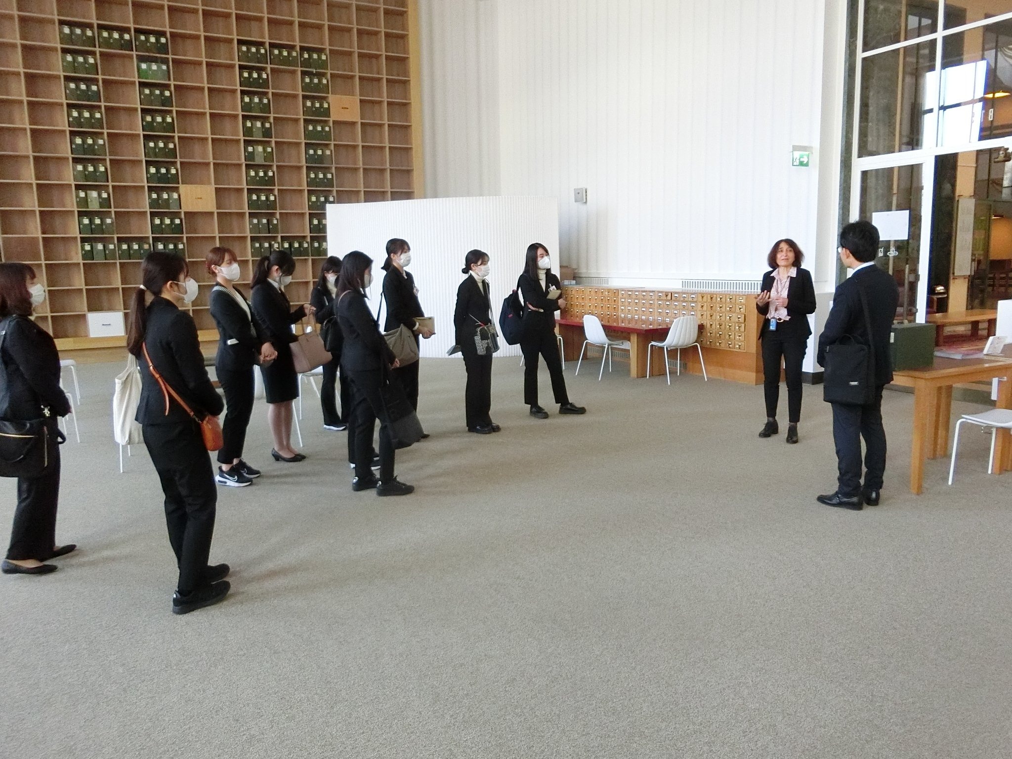 国連博物館に隣接する国連図書館も見学しました。過去の研修でもお世話になったクリスティーナ・ジョルダーノさんよりデジタル化が進む図書館の概要を学び、歴史の感じられる書庫、並びに、ノルウェーの画家による「平和の夢」と称する壁一杯の絵画のあるホールにも案内されました。