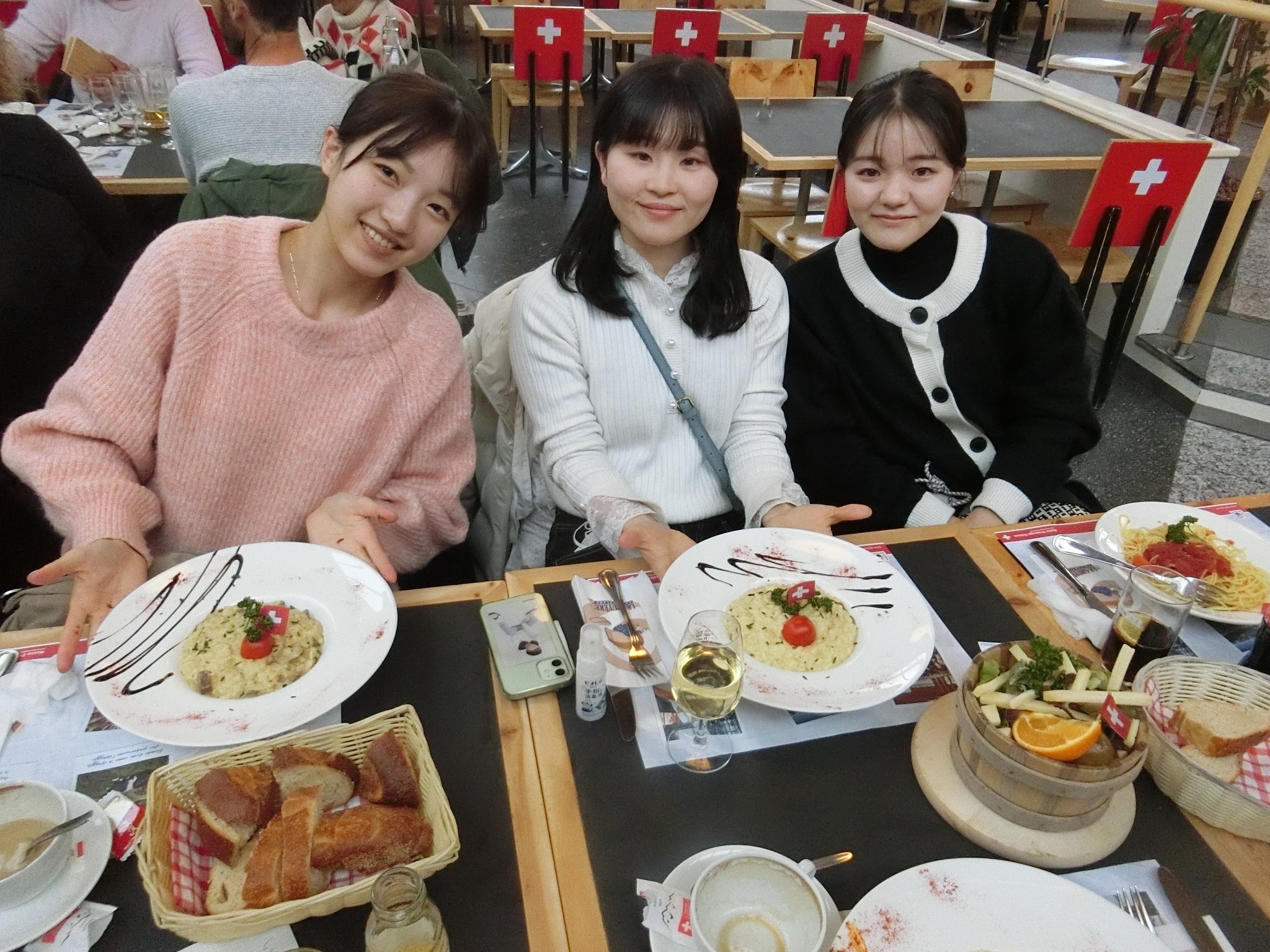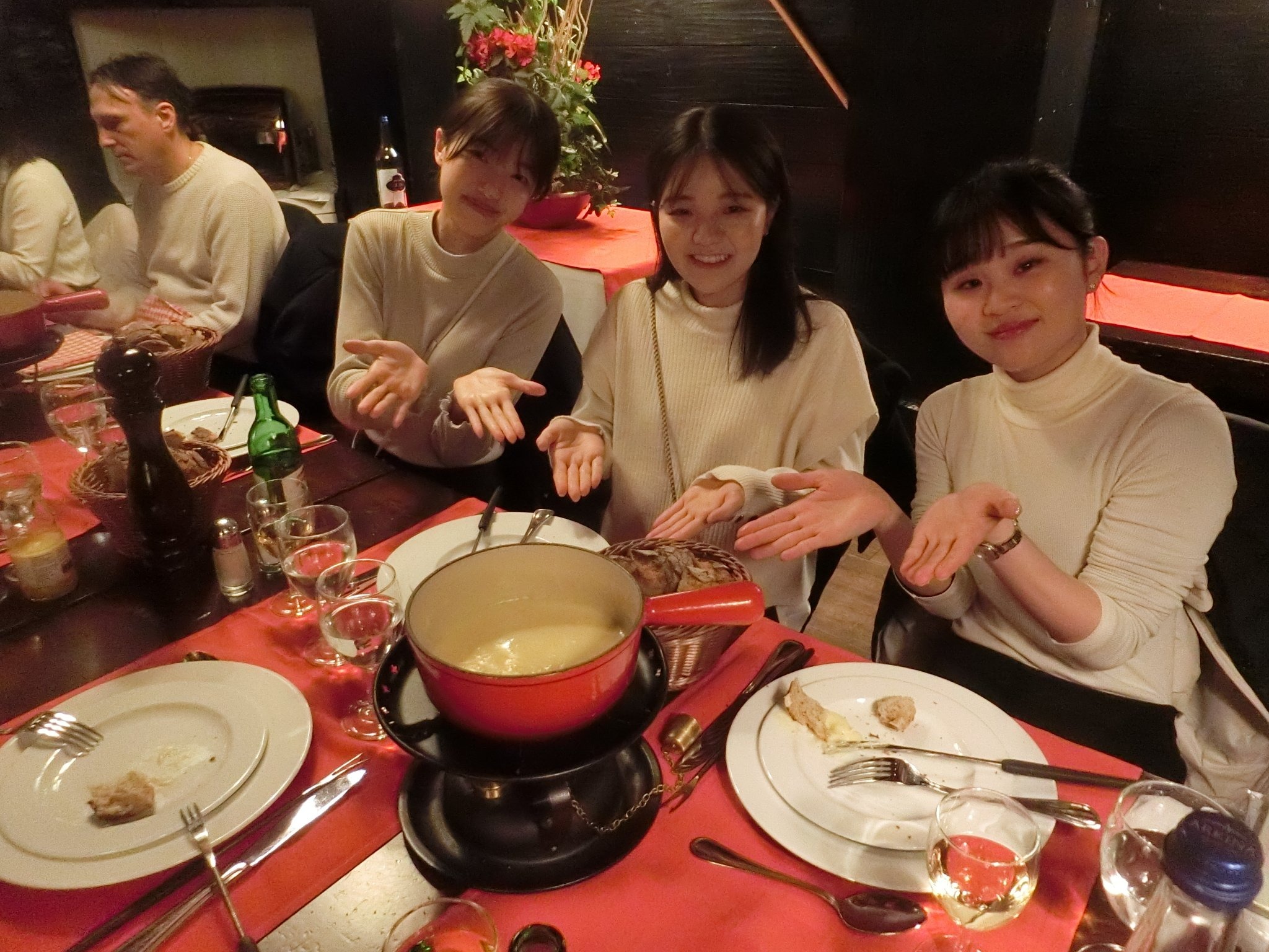 レストラン・エーデルワイスにてヨーデルの生演奏に耳を傾けながら、チーズ・フォンデュ、ミート・フォンデュ、チョコレート・フォンデュといったフォンデュづくしの夕食をとりました。食文化の面からもスイスを現場で体験する機会となりました。