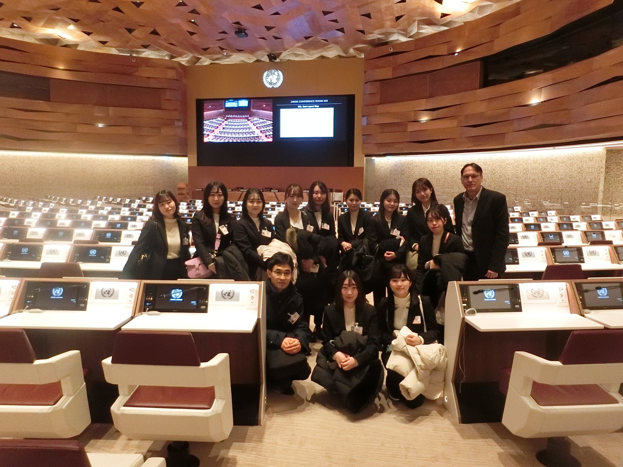 建物の中ではカタール国家が寄贈したという斬新なデザインの会議場を見学しました。さらに、国連人権理事会の一部の会議がちょうど会期中で、会場の人権ホールを見学する機会に恵まれました。会議中の撮影は控えるように言われていましたので写真はありませんが、見学コーナーでもイヤホンを耳に当てて発言内容をライブで聴くことができ、臨場感を味わうことができました。
