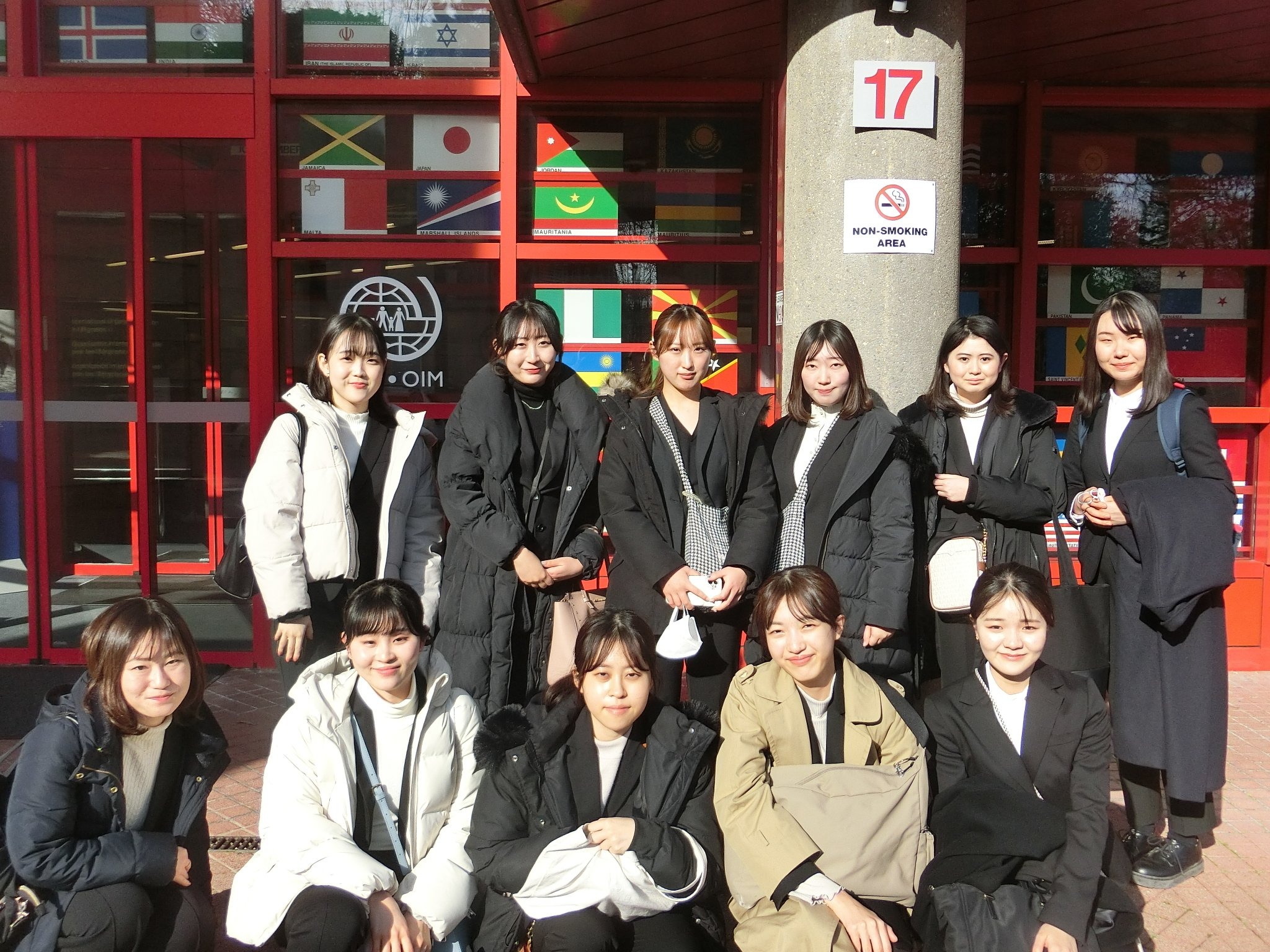 次にIOM(国際移住機関)本部に足を運びました。赤い窓枠と多数の加盟国の国章が印象的な正面玄関より中に入りました。