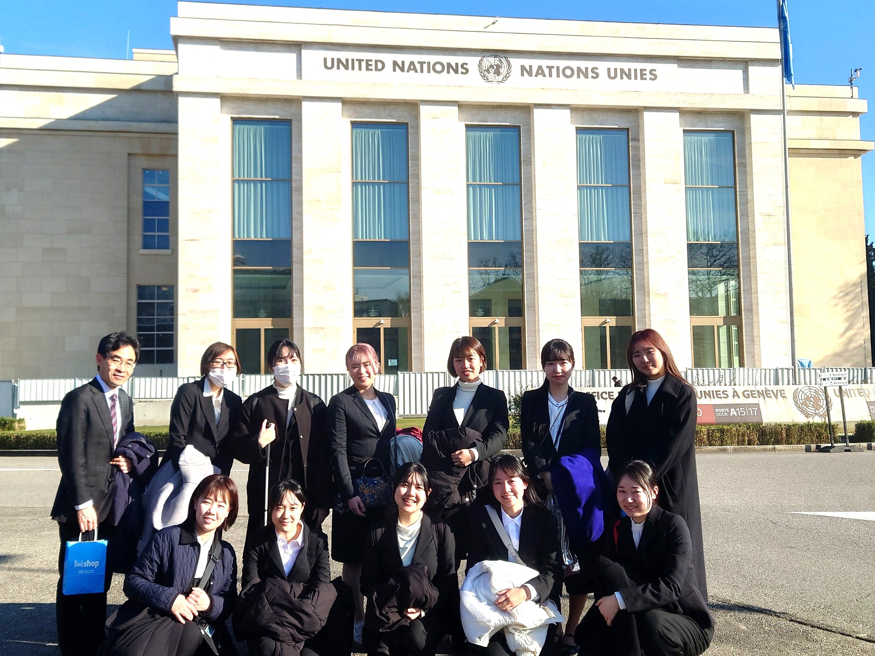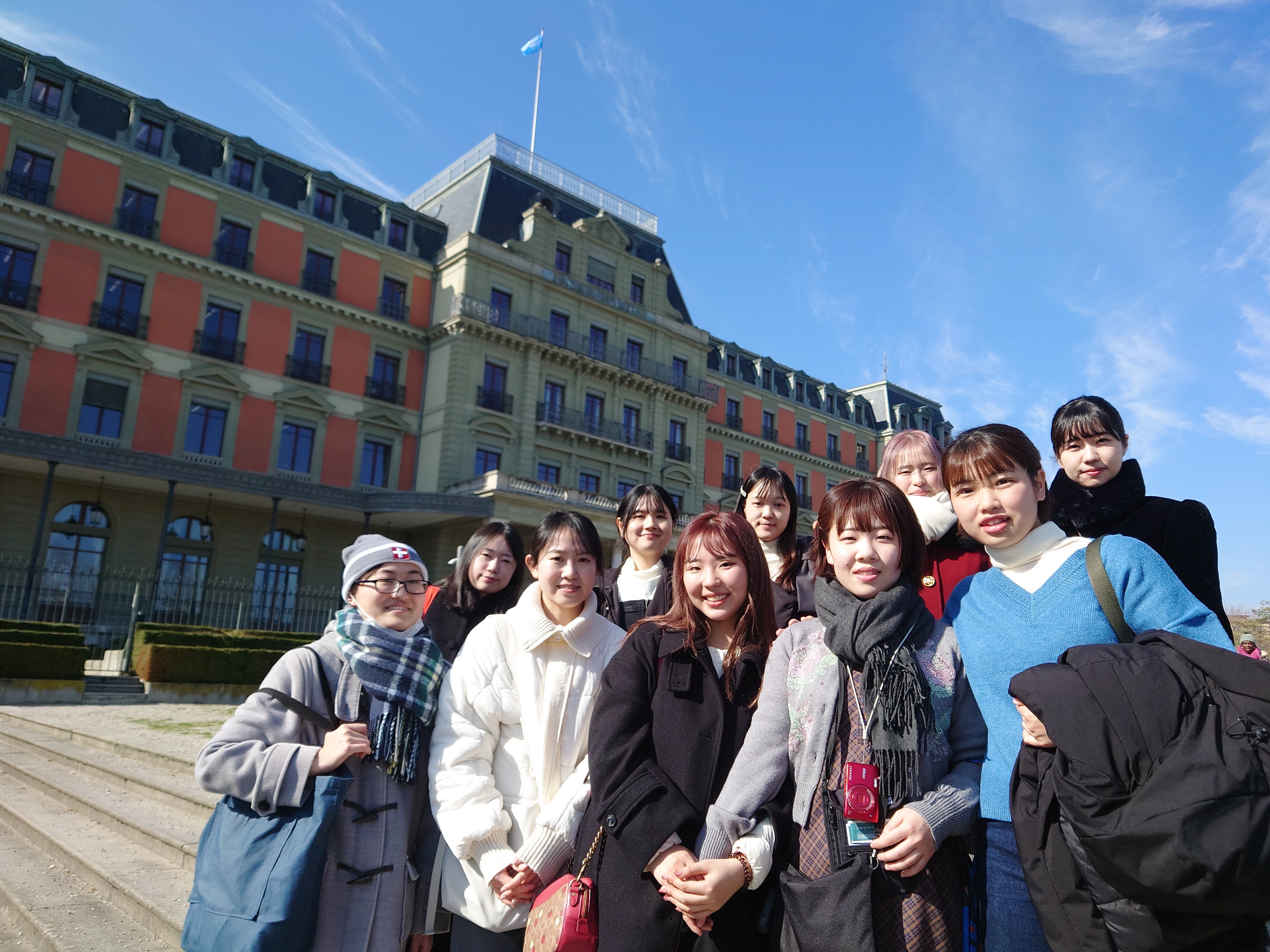 再び国連欧州本部の敷地内に足を踏み入れ、中心部の建物の前で写真を撮っていただきました。見学ツアーに参加し、ちょうど開催中の国連人権理事会を現場で見学することができたことは幸運でした。