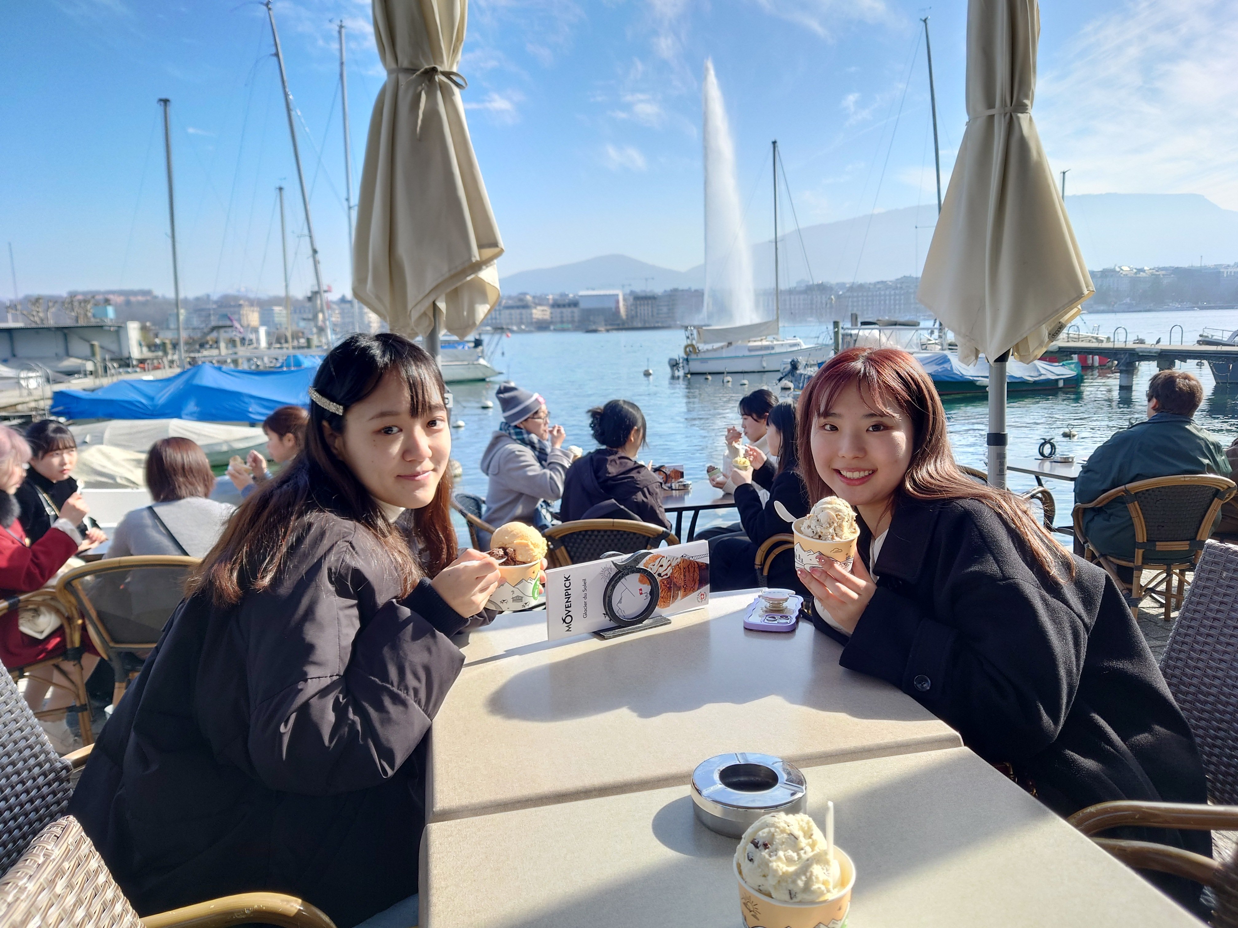 晴天に恵まれ、湖畔のテラスでレマン湖の名物の大噴水を眺めることができました。