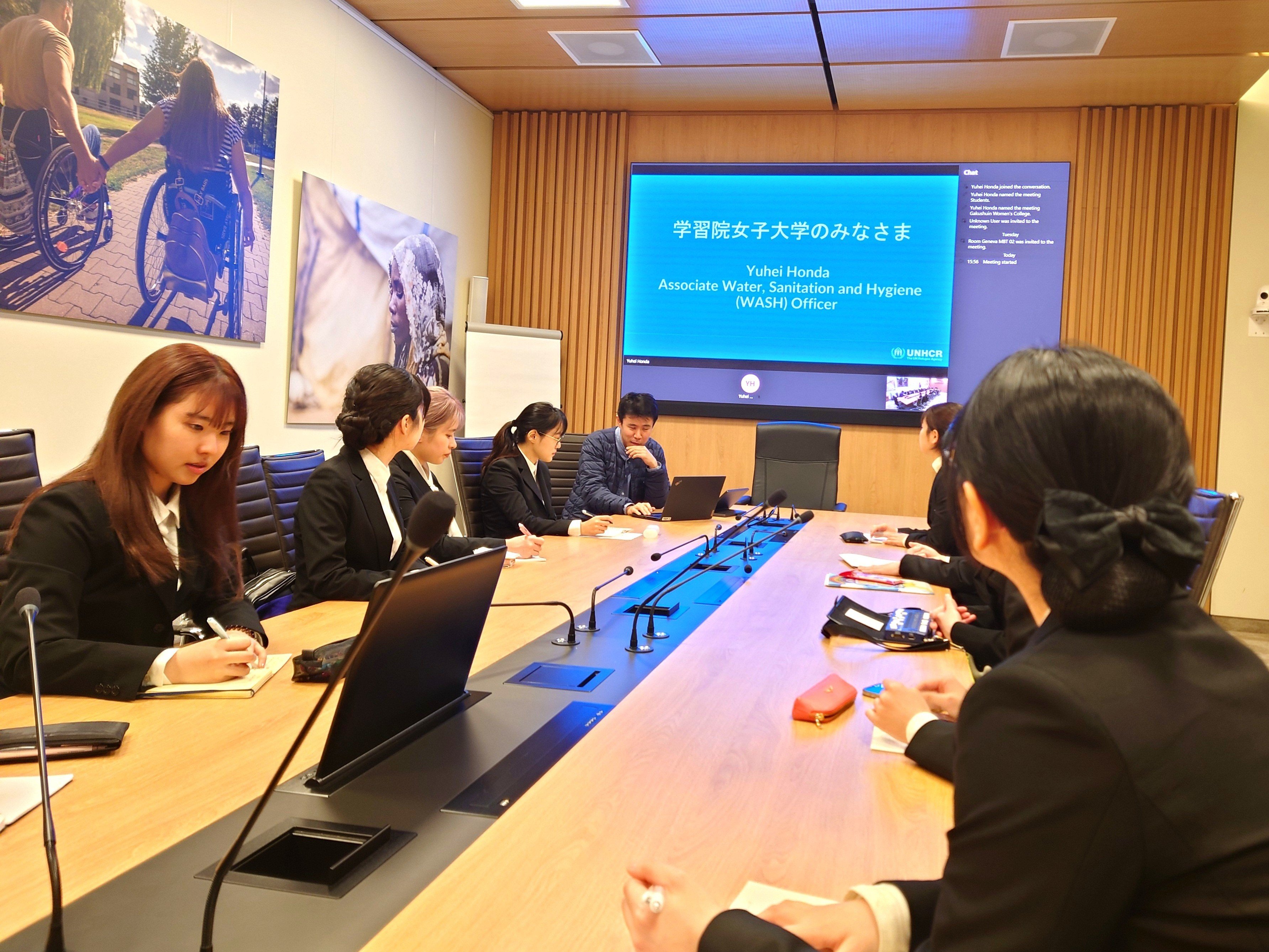 UNHCR(国連難民高等弁務官事務所)では特別な会議室に案内され、邦人職員の本田さんよりこれまでのキャリアのお話を伺いました。