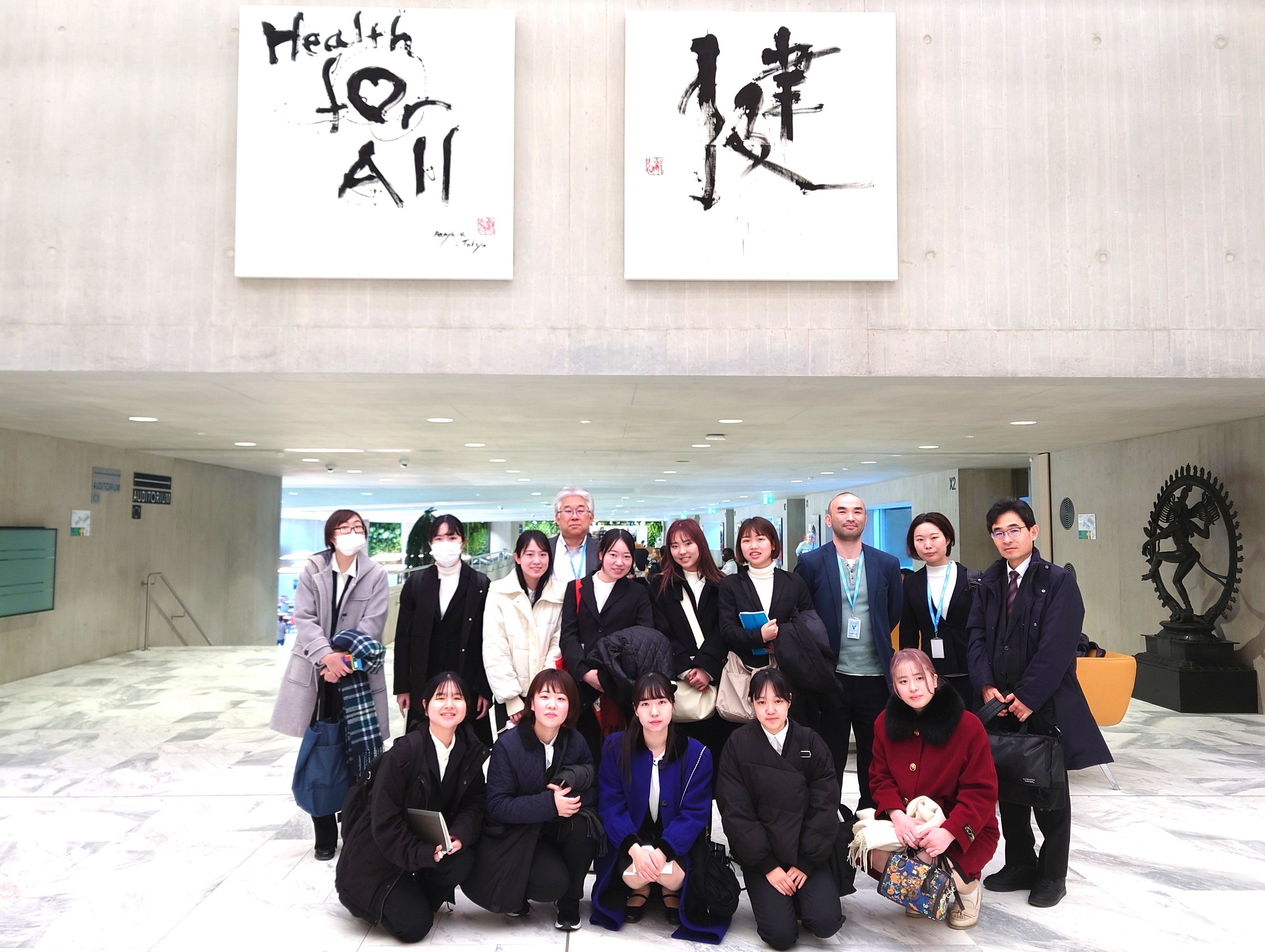WHO本部の中にも足を踏み入れました。食堂の上の階の広間にはHealth for All、健と大きく書かれた書道作品が目に留まりました。