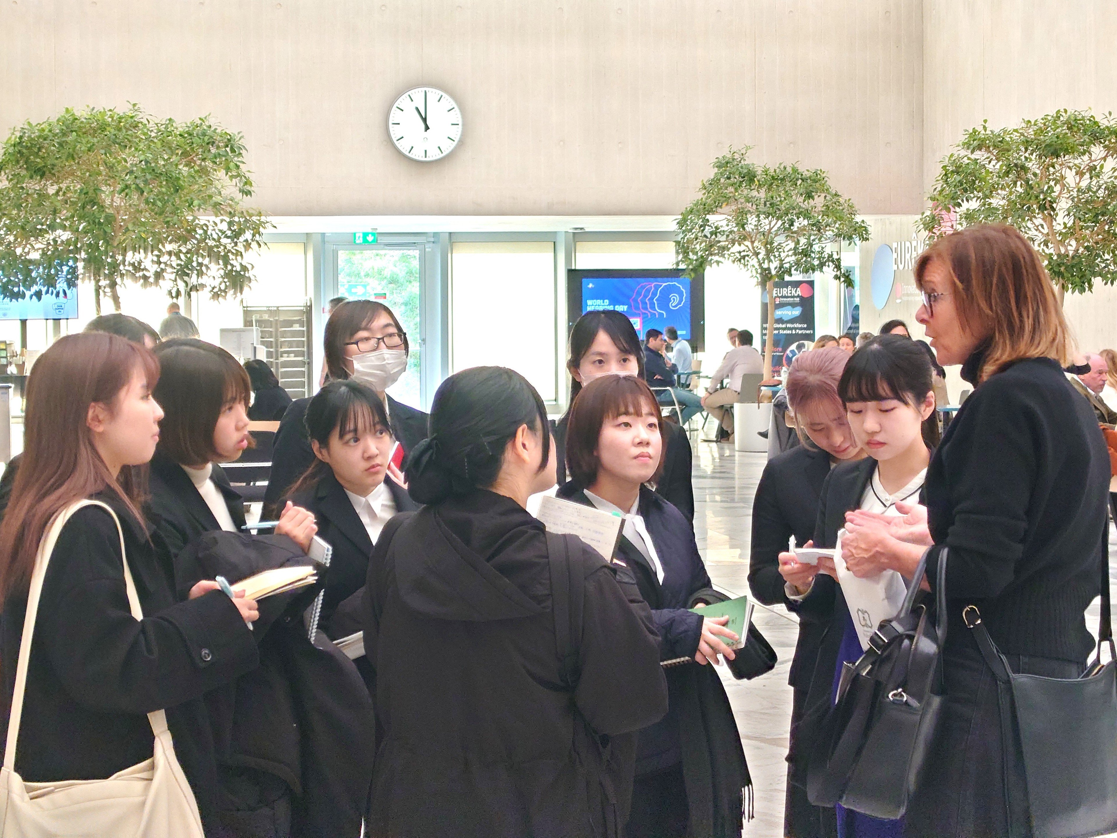 会議室でのセッションのみならず、建物内の移動に際しても、ベテランの広報担当官のDorineさんのお話を熱心に拝聴しました。