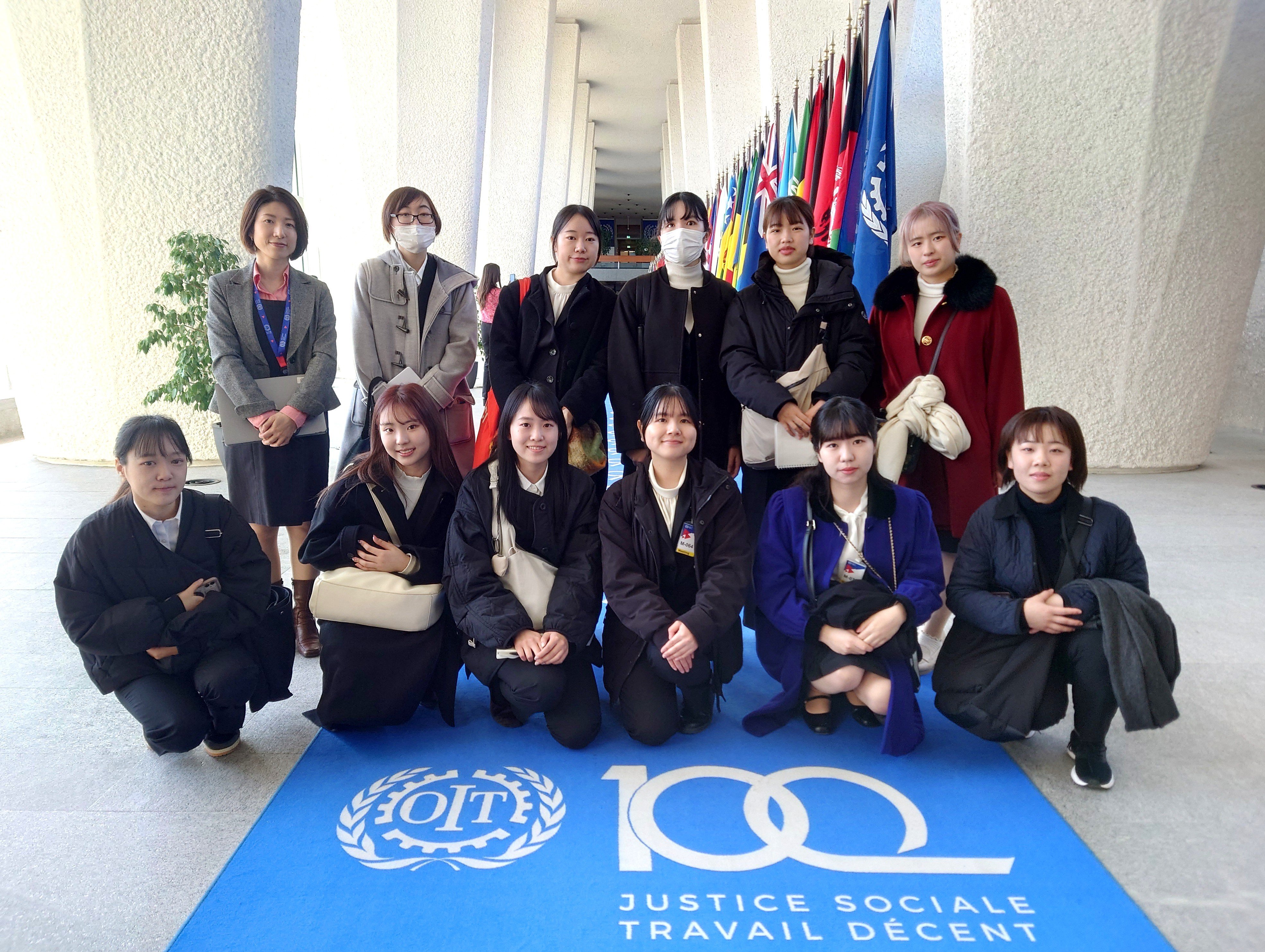 再びILOとUNICEFの建物に入り、2019年にILO創設100周年を迎えた際に制作された「社会正義」というワードが印象的な青い絨毯の前でILOの清水さんと一緒に写真を撮らせていただきました。