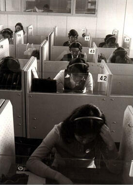 旧2号館の3階に設置されたLL教室。ひとりひとりが、ヒアリングブースの中で耳から入る音声に集中できるように設計されました。