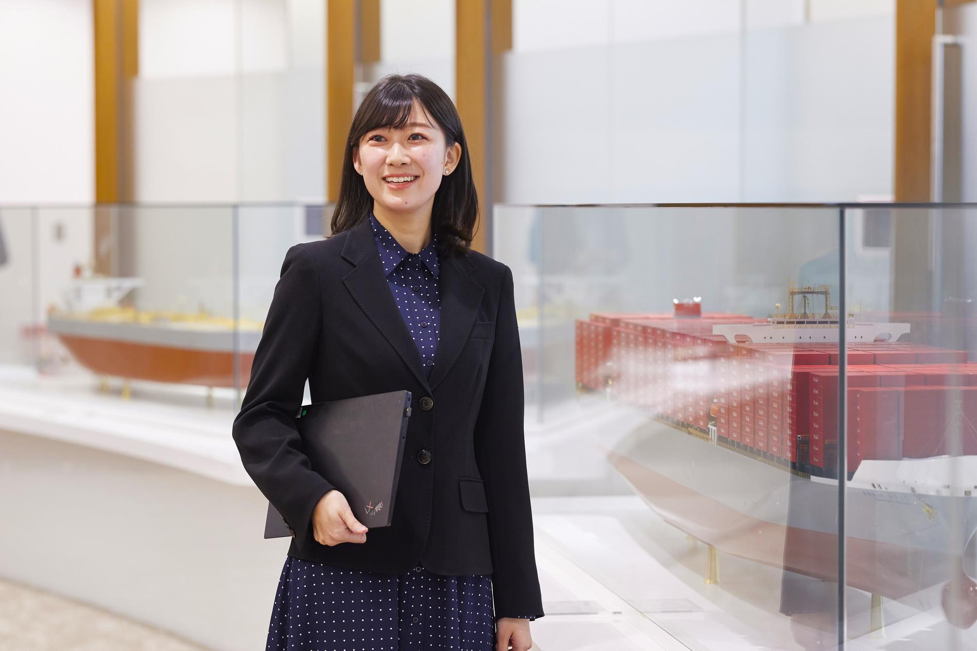 グローバル企業を軸に就職活動をしていましたが、海運の仕事を知って"こんなにグローバルでダイナミックな業界があるのか!"と驚きました。それから海運業界を第1志望に就職活動を行い、川崎汽船から内定をいただくことができました。就職を決めた一番の理由は社員の方々がとても魅力的だったからです。文字通り"世界を舞台"に仕事をしていることに誇りを持ち、生き生きと働かれている。その姿に憧れて、自分もこの会社で社会人として成長したいと強く思っていたので、内定をいただいたときはとても嬉しかったです。