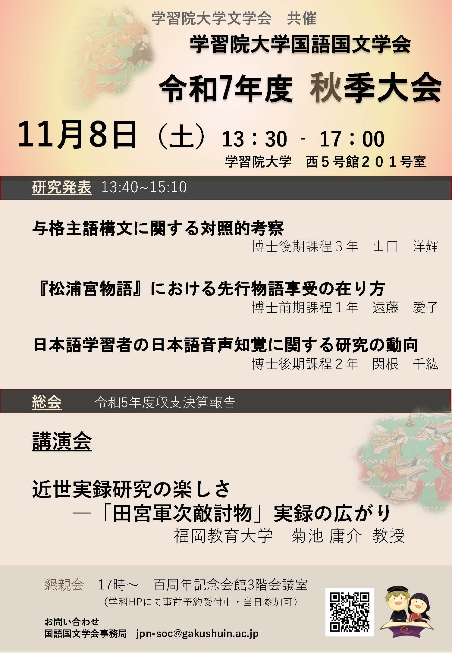 本学会では、毎年11月に秋季大会を開催しています。主に院生による研究発表や総会、講演会が行われています。研究発表会は、いわば研究者としての登竜門です。学生はともすれば目先の研究テーマに捕らわれ、狭い視野の中に閉じこもって、こと足れりとする風潮がありますが、授業はもちろんのこと、こうした学術論文や研究発表会の多様な成果を吸収することが大切です。卒業論文執筆に向けて参考になることも多く、学部2年生は必ず出席することになっています。会員の皆様も参加・聴講可能です。大会の詳細については、大会ポスターをご覧ください。