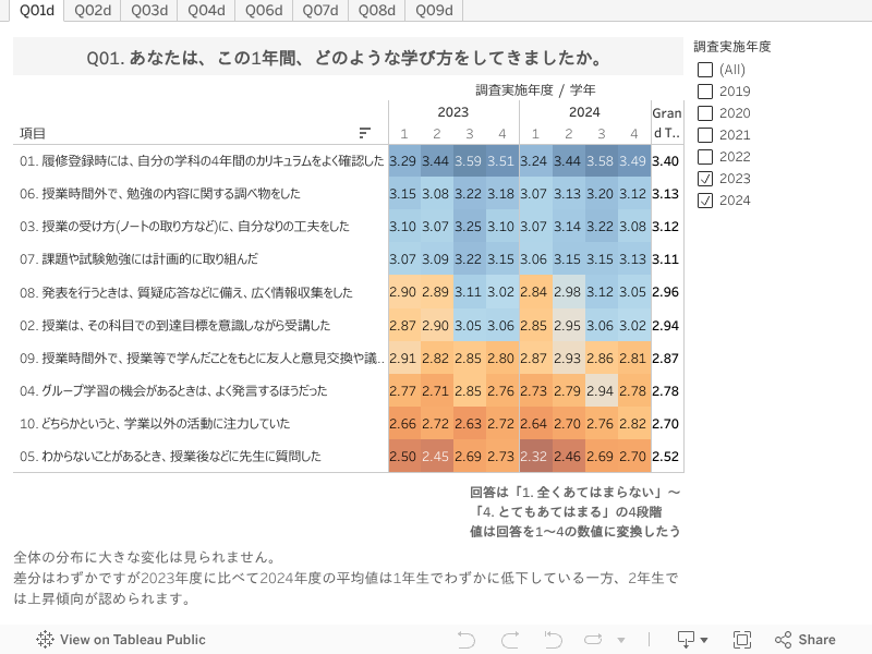 令和6(2024)年度調査の第1報として、以下に集計結果をご紹介します。同じ質問をした過年度の基本集計結果も掲載しておりますので、学年間の同異も合わせてご覧ください。どんな大学生活を送り、どんな学びに手応えを感じているかや、進路に関する意識など、本学学生の一面を伺い知ることができます。