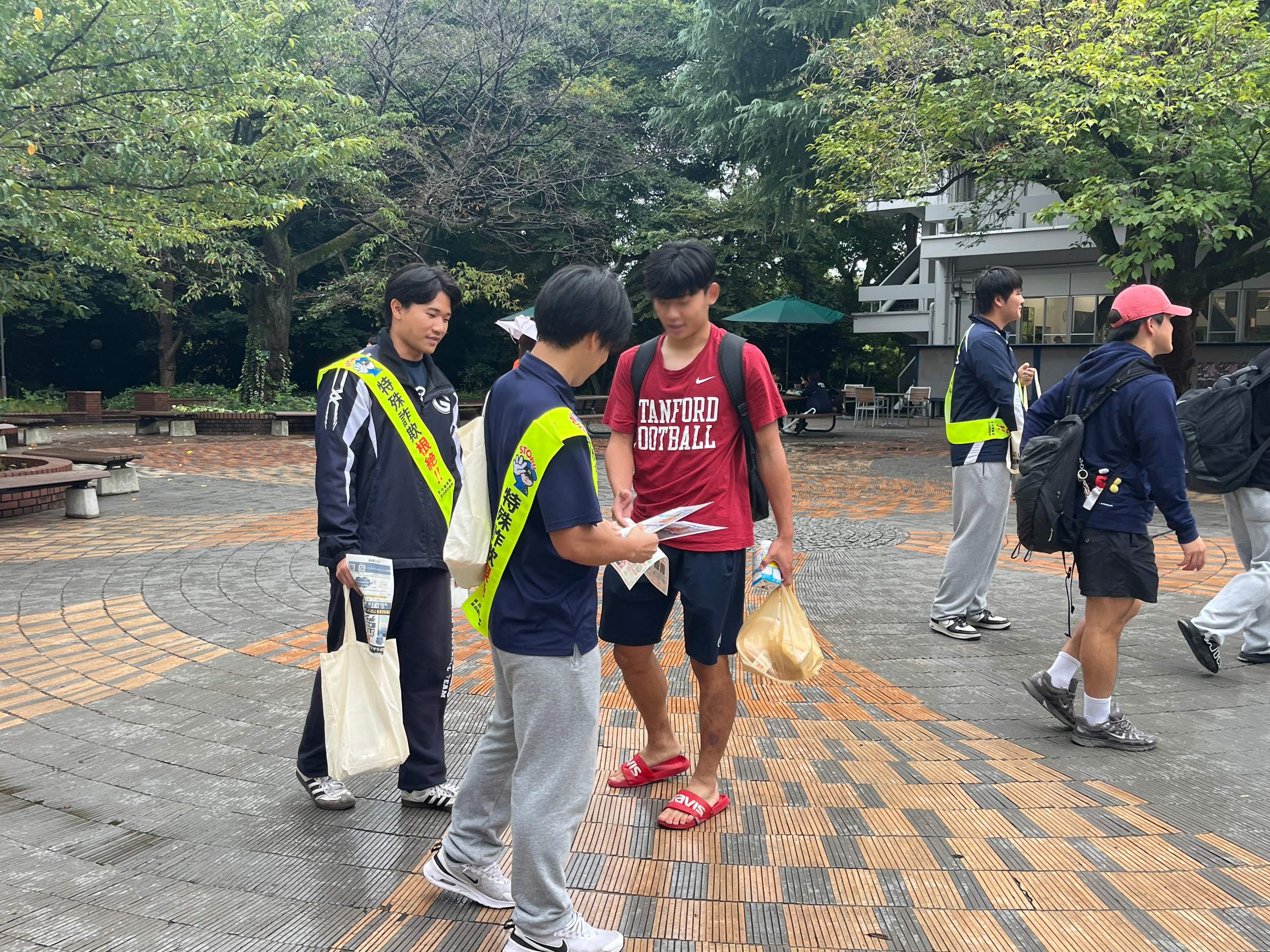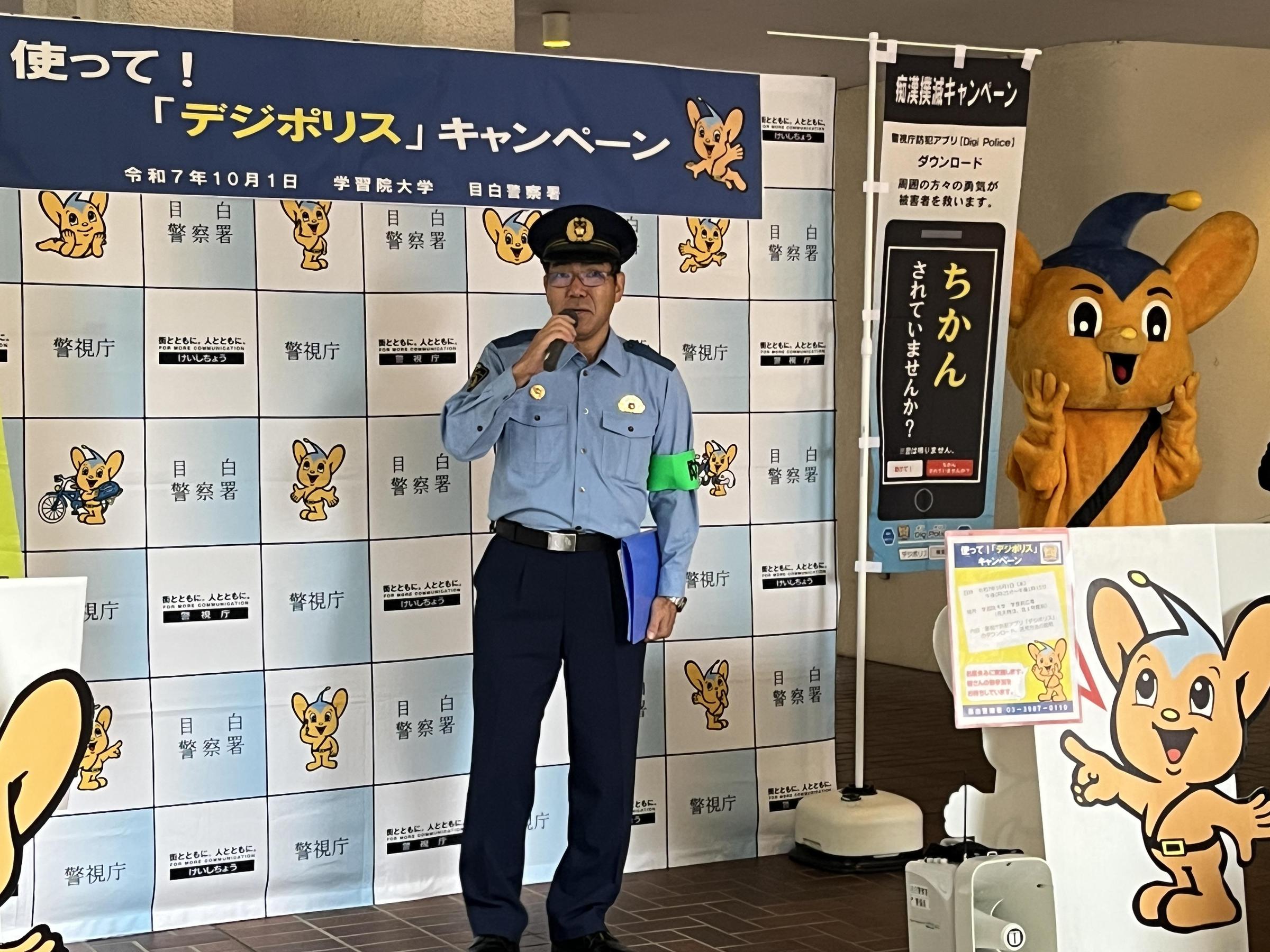 10月1日、目白警察署による、警視庁防犯アプリ「デジポリス」の普及啓発キャンペーンが本学目白キャンパスで行われました。アメリカンフットボール部の学生が、チラシの配布やアプリのダウンロード・活用の呼びかけに協力しました。