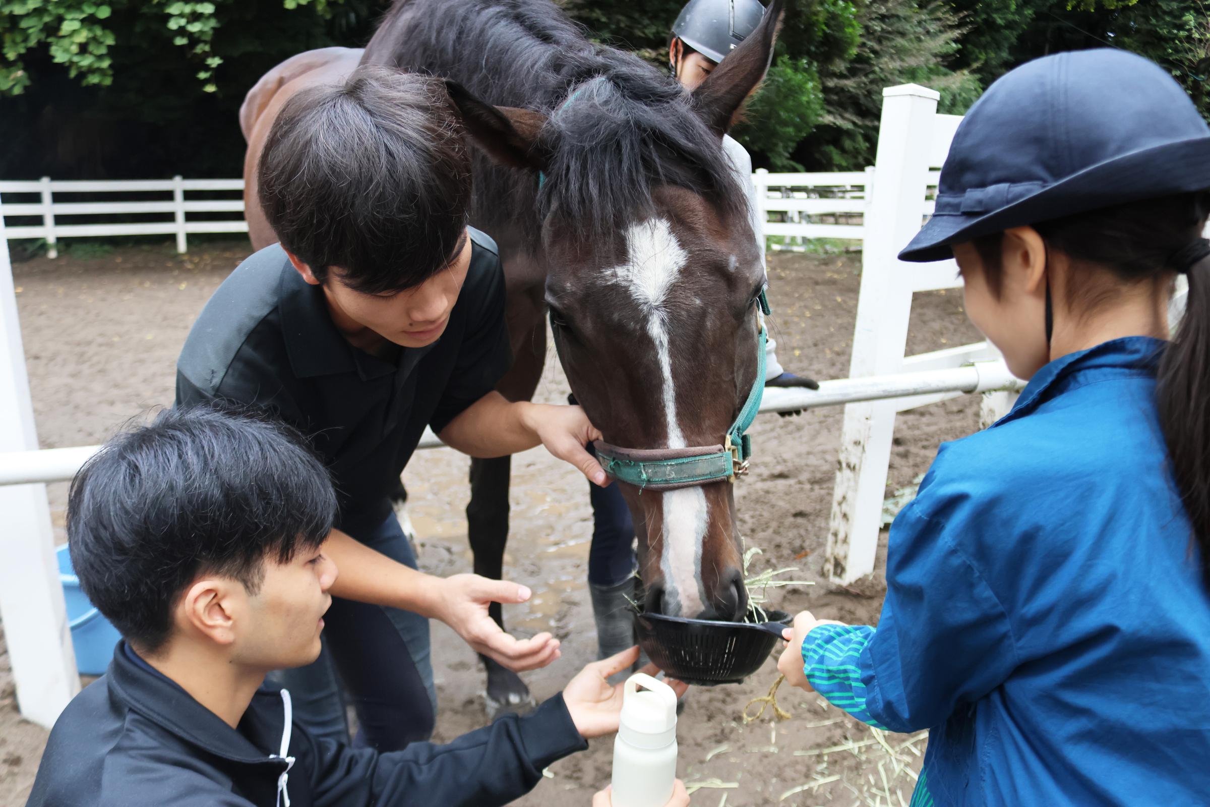 児童全員が馬場での練習風景を見学後、グループに分かれそれぞれ餌やり体験、厩舎内見学、馬運車見学をしました。