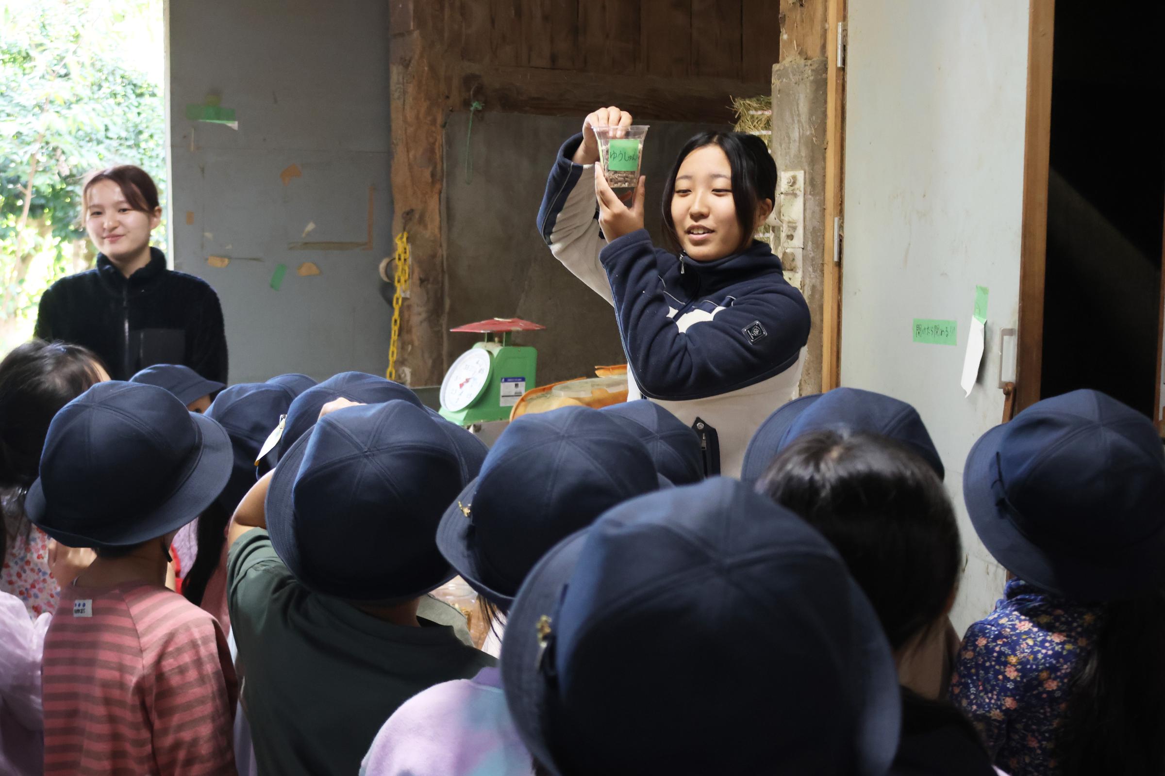 厩舎内では馬具や飼料についての説明があり、馬運車内も見学。児童から挙がるいろいろな質問に馬術部部員が回答しました。