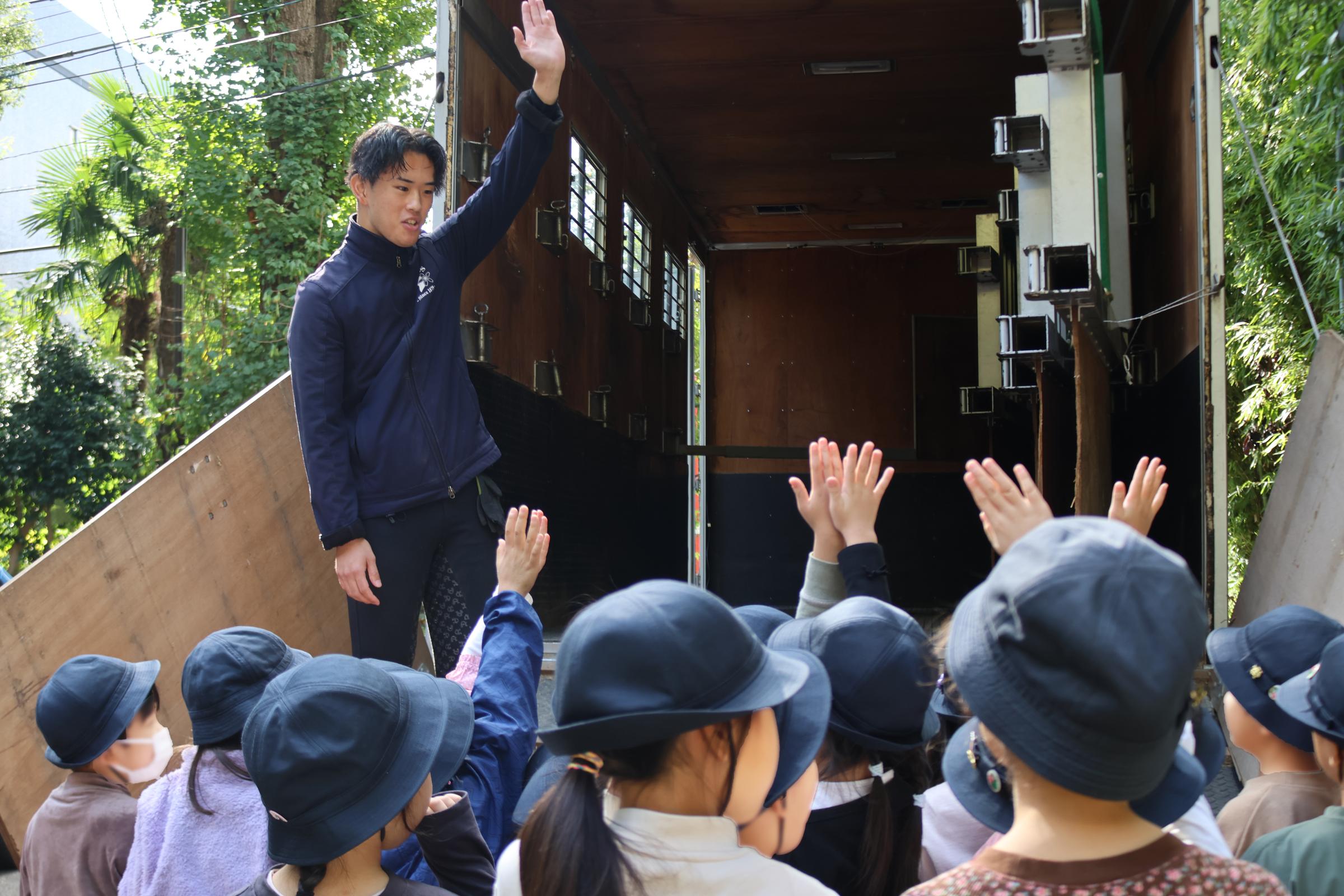 その取り組みの一つとして、今年も豊島区立目白小学校児童(1年生・2年生)に対して厩舎見学を実施しました。
