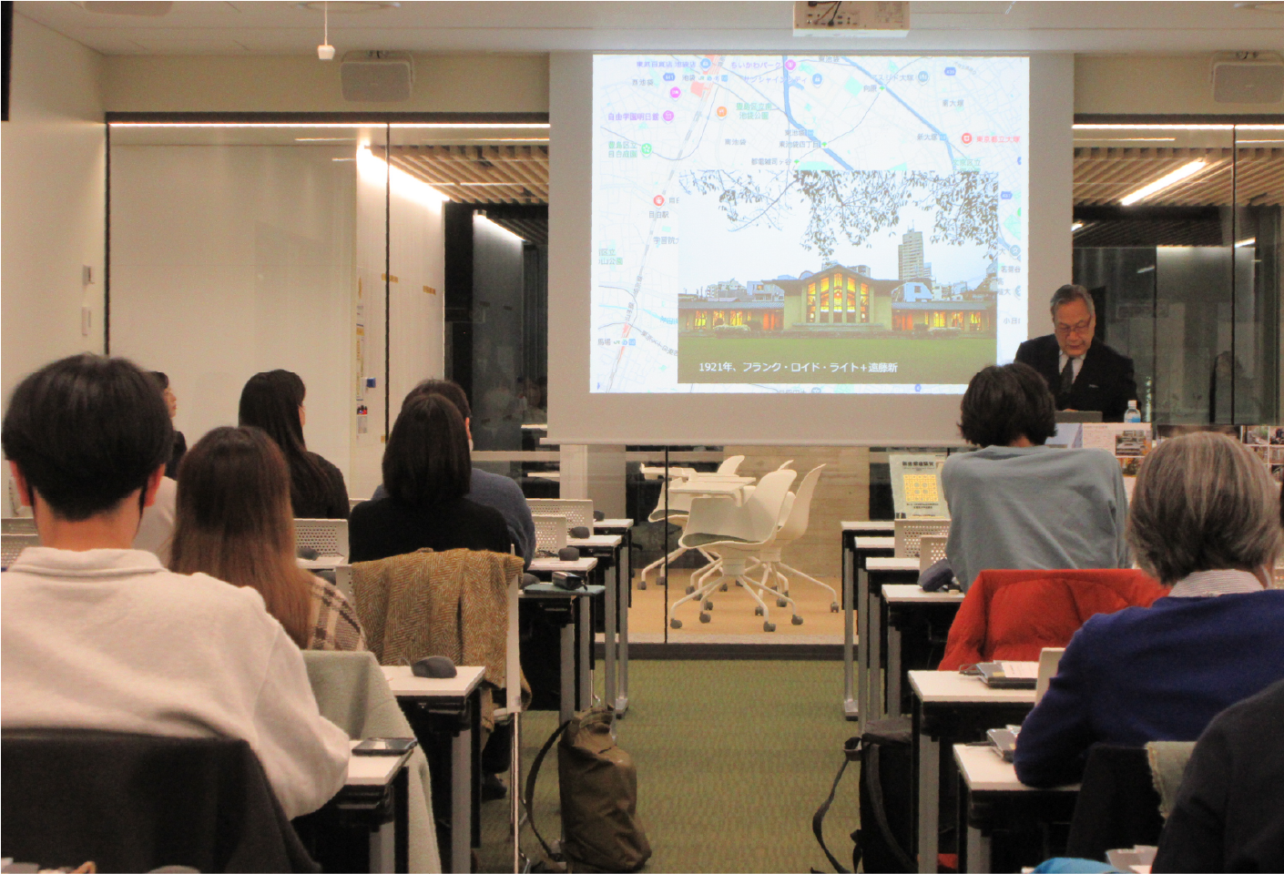 講師には公益社団法人日本図書館協会理事長の植松貞夫先生をお迎えし、目白キャンパス内外の様々な建築物の紹介や、図書館の成り立ちを踏まえた図書館の役割の変化、海外の図書館建築事例など、機能・建築、両方の観点から図書館についてご講演いただきました。