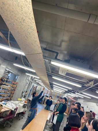 反物1反の長さは約12メートル。その反物を広げることのできる1枚続きの木の板は現在とても貴重であることや、1反を染めるのに何度も型を移動しながら模様をつけていくといったお話に、留学生は熱心に耳を傾けていました。